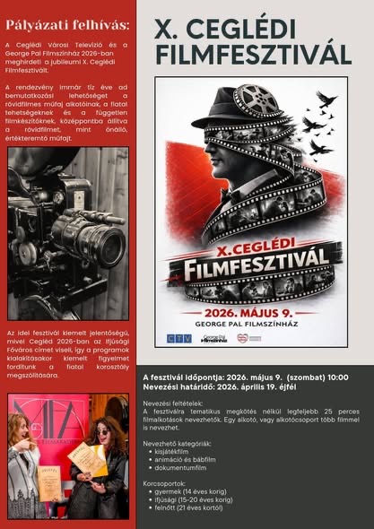 Idén, 2026-ban tizedik alkalommal kerül megrendezésre a Ceglédi Filmfesztivál. Május 9-én találkozunk a George Pal Filmszínházban. Nagy öröm, hogy Cegléd, George Pal szülővárosa ennyire becsben tartja és őrzi nagy szülöttének emlékét! A fesztivál időpontja azért is figyelemre méltó, mivel május 2-án emlékezünk meg George Pal halálának 46. évfordulójáról.