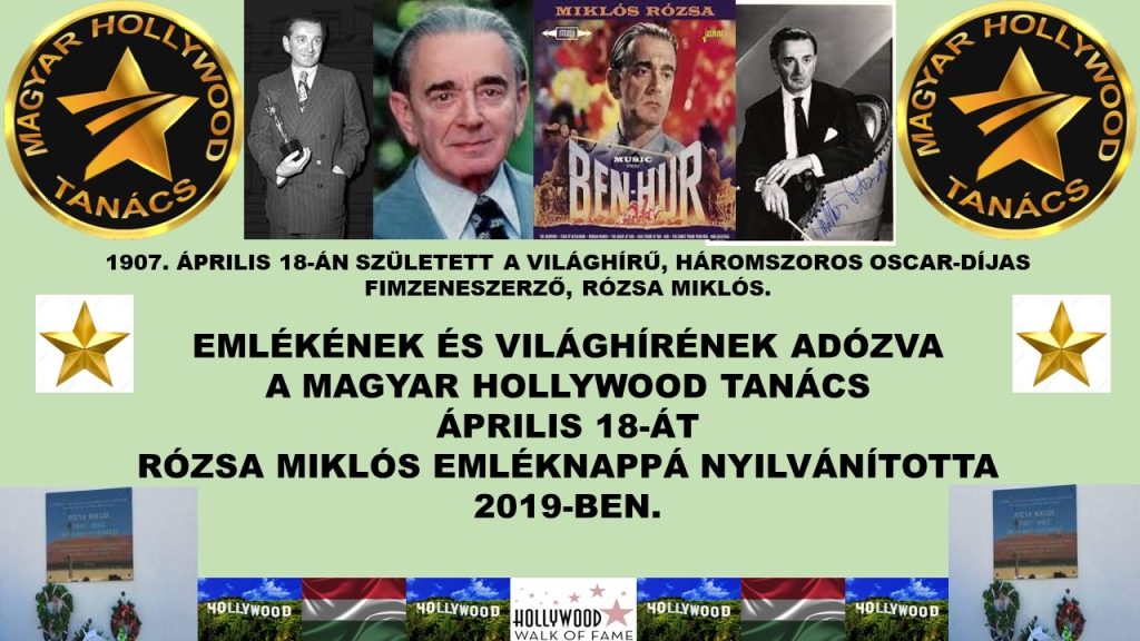 119 éve született Rózsa Miklós. A Magyar Hollywood Tanács születésének napját 2019-ben Rózsa Miklós emléknappá nyilvánította. A Tanács a nagyszerű zeneszerző emléke előtt fejet hajtva, a Nógrád megyei Nagylócon található emléktáblájánál szokott koszorút elhelyezni, illetve különböző budapesti helyszíneken tart megemlékezéseket.